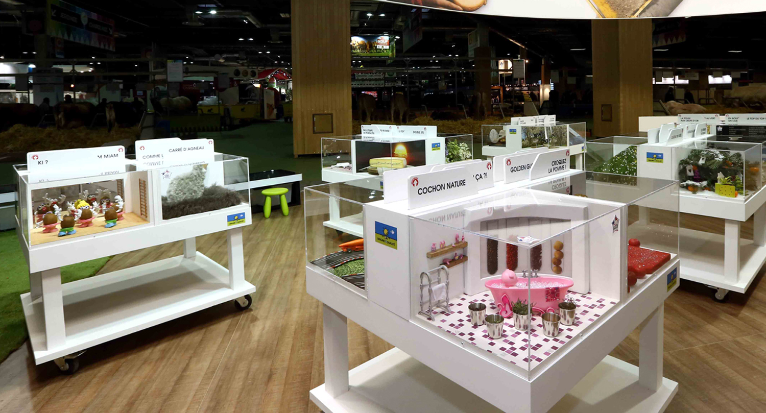 Carrefour s’expose au Salon de l’Agriculture. La société Live! en collaboration avec le standiste Les Ateliers ont conçu le stand Carrefour pour faire découvrir aux enfants, de manière ludique, l’origine de leurs produits du terroir.