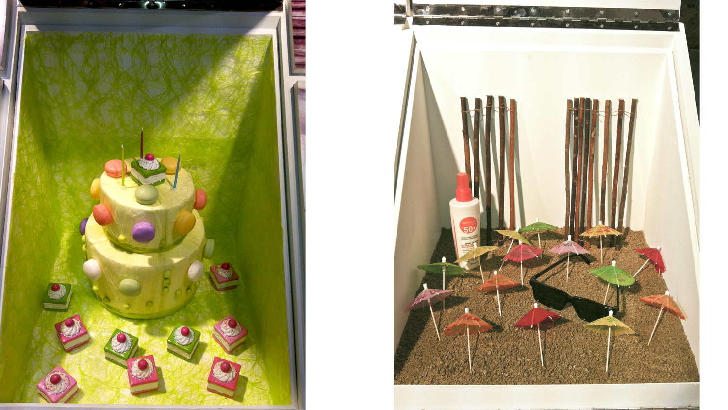 Nous étions chargés d’accessoiriser les boites déjà construites. Seule contrainte : voir le produit ! liberté totale pour le mettre en valeur. Autant de boîtes que de mini-scènettes espiègles.